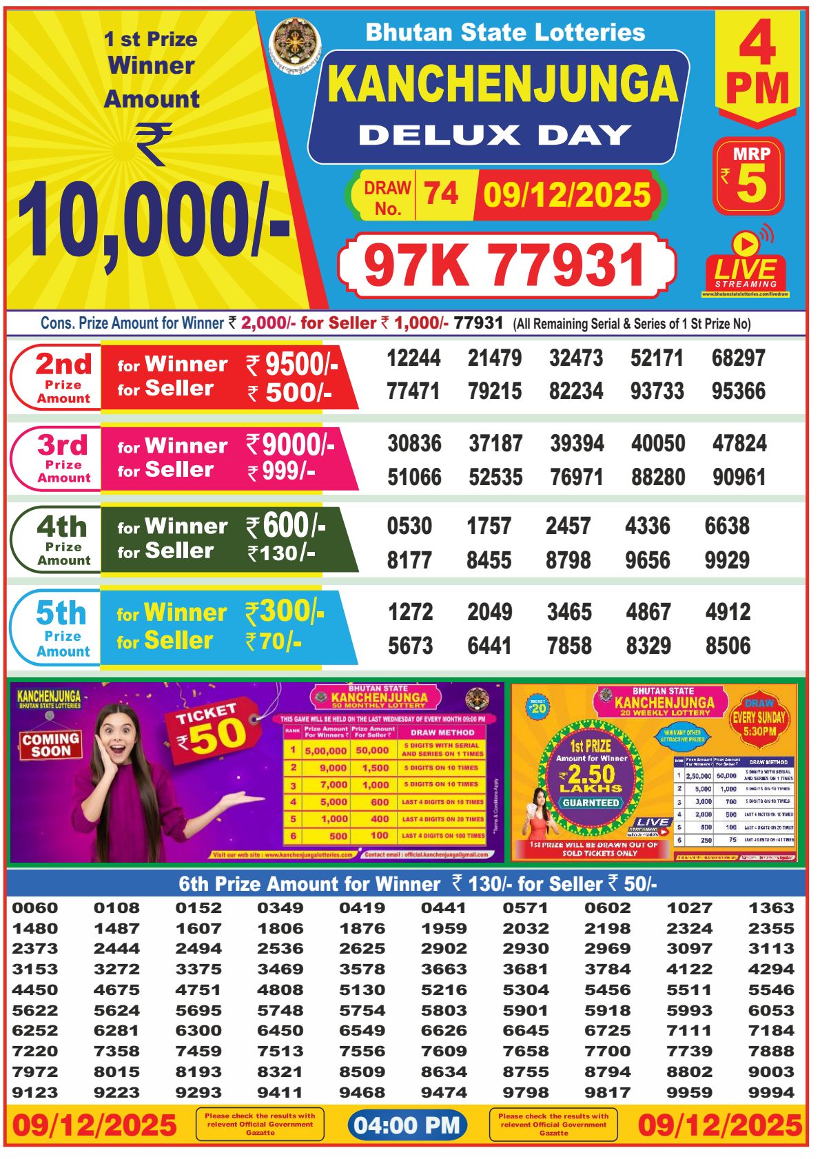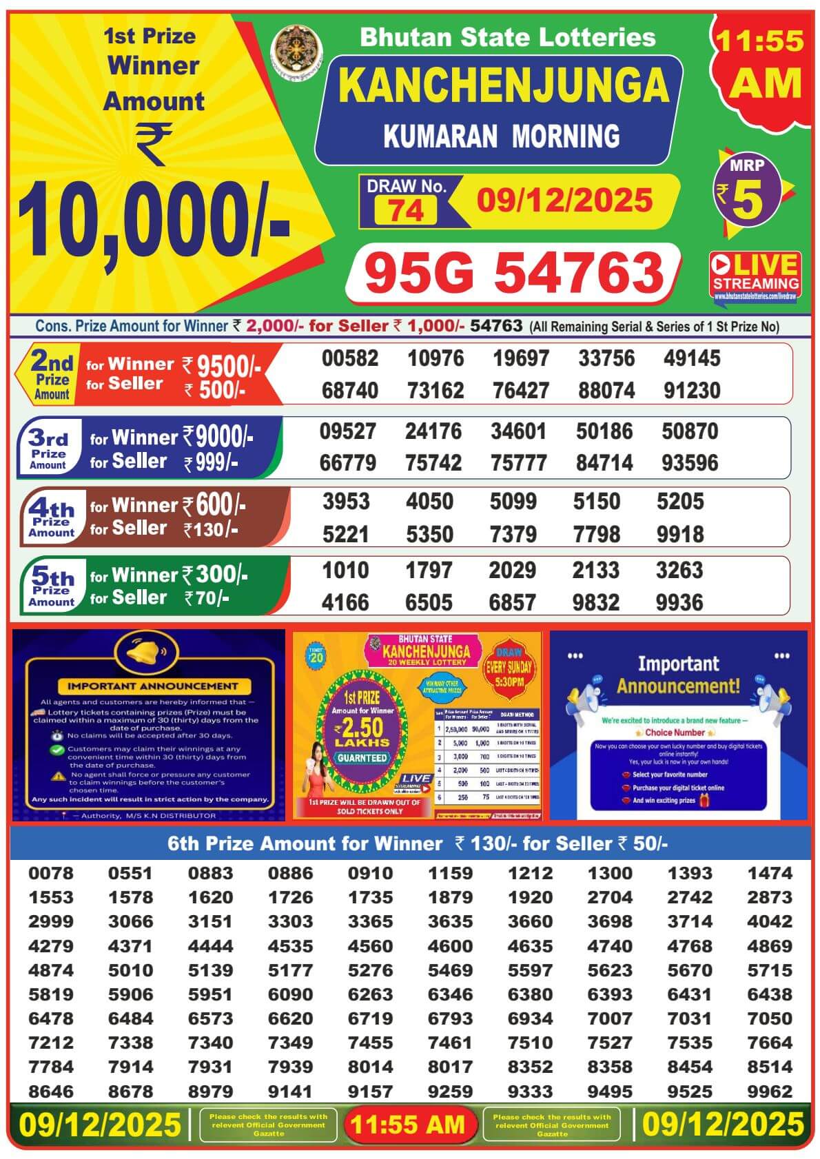 There are seven Kanchenjunga weekly lotteries conducted by the Bhutan State Lottery with a first prize of ₹10,000/-. The price of each ticket costs ₹5/-. The draw is conducted three times a day at 11:55 AM, 4 PM, and 8 PM with different schemes depending on both draw day and draw time.